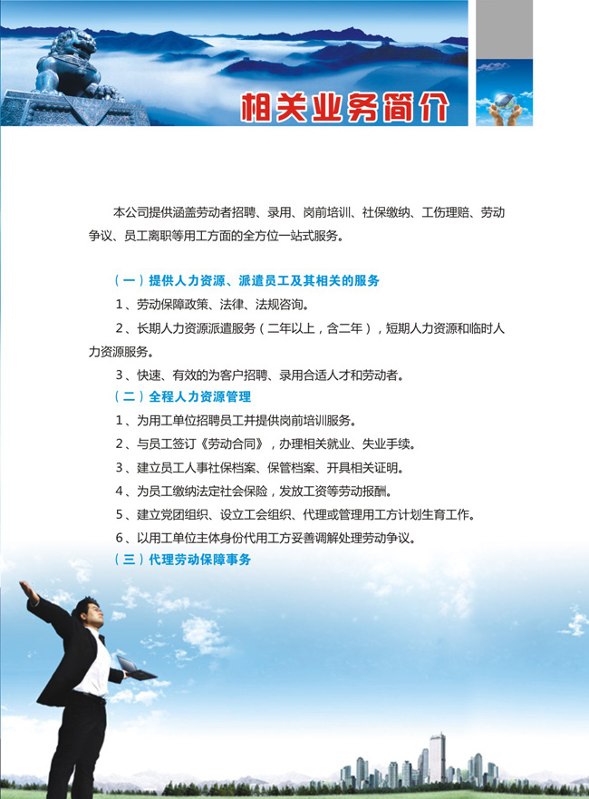 本公司提供涵蓋勞動者招聘、錄用、崗前培訓、社保繳納、工傷理賠、勞動爭議、員工離職等用工方面的全方位一站式服務。
